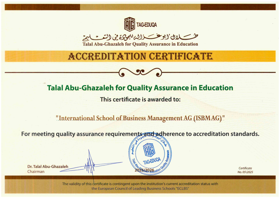 عمان – في إنجاز جديد يعكس التزامها بمعايير الجودة والتميز التعليمي، حصلت المدرسة الدولية لإدارة الأعمال  ISBMAG  الدولية في سويسرا على شهادة الاعتماد الأكاديمي من مؤسسة طلال أبوغزاله للجودة في التعليم، وذلك بعد اجتيازها بنجاح عملية التقييم الشامل التي أجراها فريق خبراء الجودة لدى المؤسسة.
