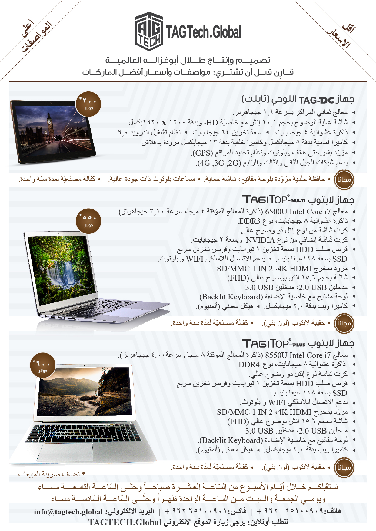 عمّان- أعلنت "طلال أبوغزاله ا لعالميّة" عن وصول أجهزة شركة طلال أبوغزاله التقنية؛ الجهاز اللوحي (TAG-DC) والأجهزة المحمولة (TAGITOP-Multi و TAGITOP-Plus).