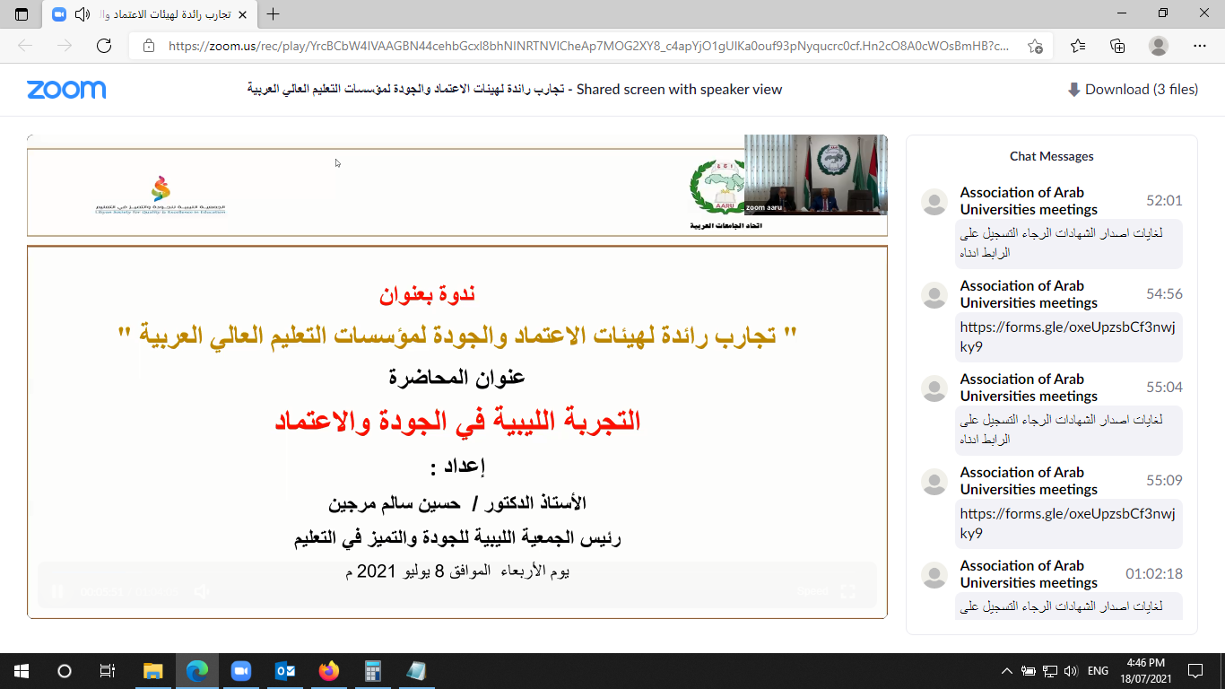شاركت المنظمة العربية لضمان الجودة في التعليم في ندوة تفاعلية بعنوان "تجارب رائدة لهيئات الاعتماد والجودة لمؤسسات التعليم العالي العربية" والتي عقدها اتحاد الجامعات العربية يوم الخميس الموافق 8/7/2021 على برنامج زووم.