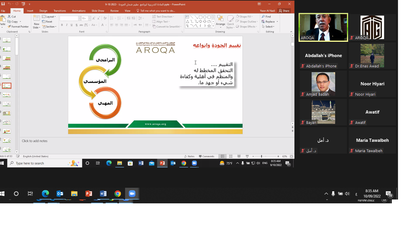 عَمّان – اختتمت المنظمة العربية لضمان الجودة في التعليم، البرنامج التدريبي " مقيم ضمان الجودة في المؤسسات التعليمية " بنسخته الثالثة عشر، عبر وسائل التواصل المرئي والمسموع التي عُقدت في 10 أيلول سبتمبر إلى 7 تشرين أول أكتوبر 2022.